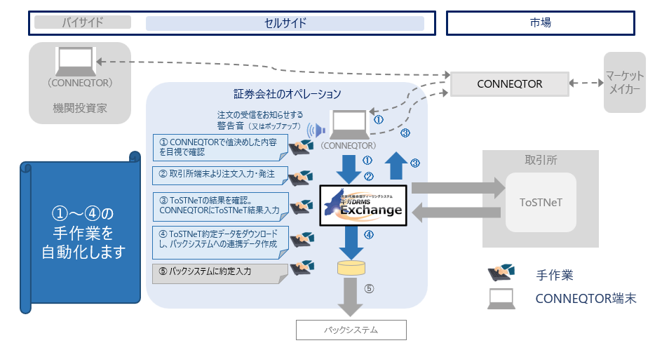 ギガDRMS導入当初、機関投資家からCONNEQTOR経由で届いた注文を、担当者がギガDRMSから立会外取引で発注を行い、約定結果についてもバックシステムへ担当者が取り込む運用を行っていました。